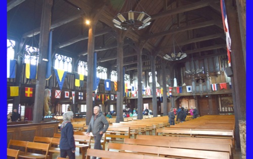 In the afternoon, we retraced our steps to the Museum of Ethnography. There were several rooms both upstairs and down. We had fun trying our the phone app translate with the docent on the second floor. Leaving the museum, of course we had to have our pictures taken in the jail. We then went around the corner to the Marine Museum. Lots of beautiful model ships. One of the interesting pieces was a tiered set of trays on a litter carried around town on men’s shoulders. It was for consecrated bread for the sailors returning from fishing trips to Newfoundland.