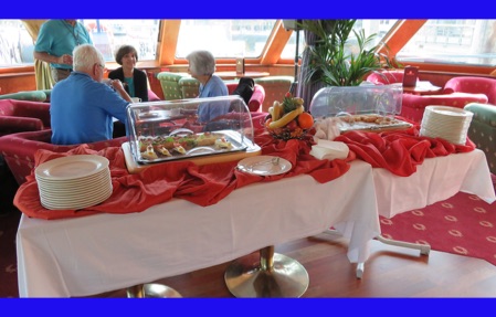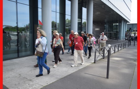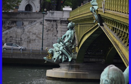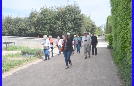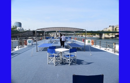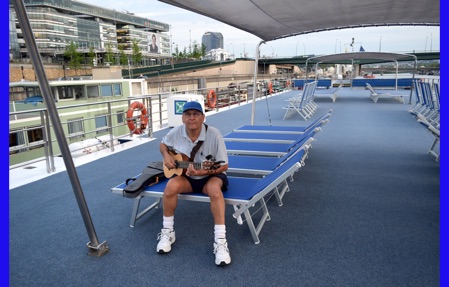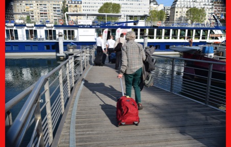 We unpacked and much to our surprise found a place for everything in our little cabin. After lunch our guide Isabelle Gauthier took us on a neighborhood acclimation tour, pointing points of interest and giving us hands-on experience with using both bus 47 and the train (R & R), both take us into the sightseeing areas of Paris. When using the R & R, one must keep the ticket because it is needed again to exit the R & R. No one wanted to miss the boat trip because of being locked in the R & R. We walked through Citroen Park and watched many Parisians enjoying it. She also showed us the market, pharmacy, the liquor store and other places we might need to visit. Back on ship we had a welcome drink with our program director and were introduced to the crew. An absolutely delicious dinner, but far too many courses for us sleep-deprived travelers. After dinner, Jorge played his guitar on the deck just to amuse himself.
