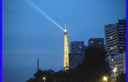 The Eiffel Tower at night from the top deck of the M/S Bizet. It was raining.