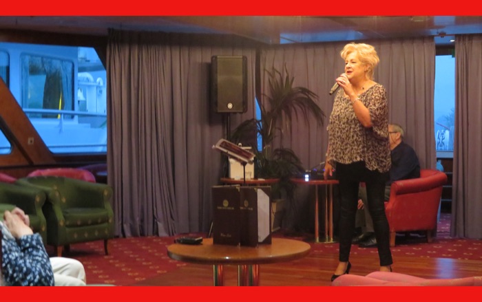 After dinner, Evelyne, a singer with a throaty nightclub type voice came on board to entertain us. Some of us even danced.