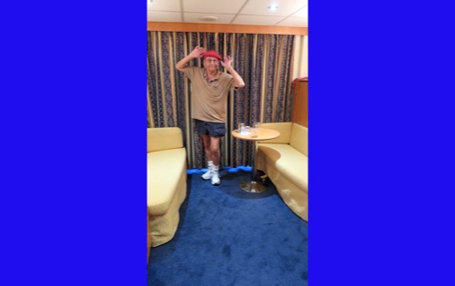 This was French night. We dressed in red, white, and blue, the colors of the French flag. Jorge donned the beret he had bought for his mother and looked tres français.