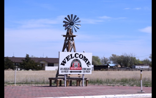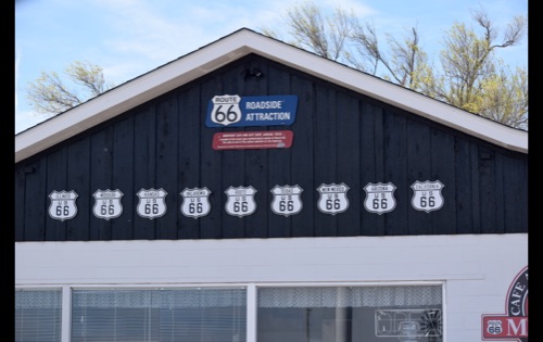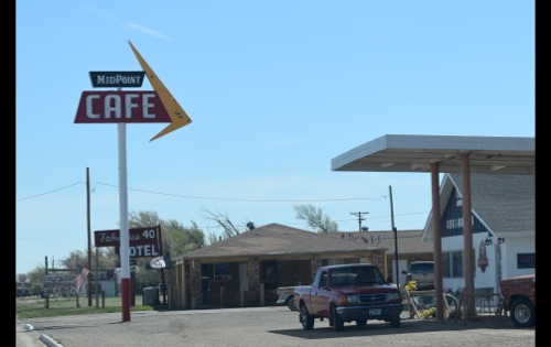 Above is one of our favorite stops before leaving New Mexico going East. It is Russell’s Travel Center which hosts a Route 66 Car Museum. (Left) We found the mid-way point on Route 66. Before reaching Amarillo TX we zoomed by the famous Cadillac Ranch.