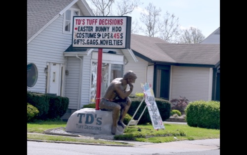 Before lunch in Owensboro KY we headed out to take a couple of drive-by shots (with the camera). The first is obviously a copy of The Thinker by Auguste Rodin. This statue sits in front of a gift shop. Hmm, what to buy, what to purchase? Deep Thoughts!