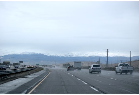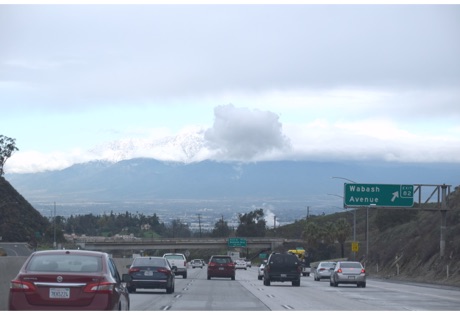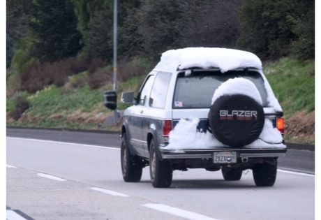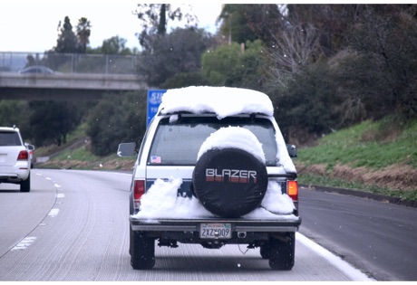 We headed home on our final day on the road only to find that it does rain in Southern California. From the desert we could see snow in the mountains. You have to understand out mentality here. We don’t see the white stuff very often. So, it’s not unusual for someone to ride his car up to the hills and then pile snow on his vehicle. It’s one of those “guess where I’ve been having fun and you haven’t been” type of things.