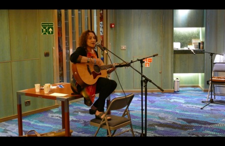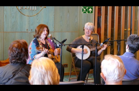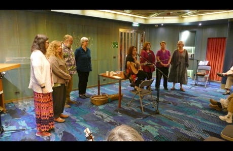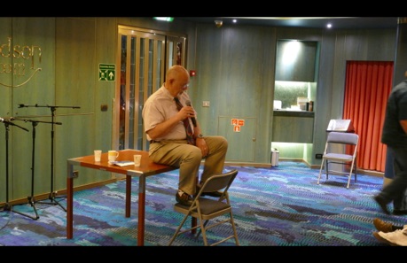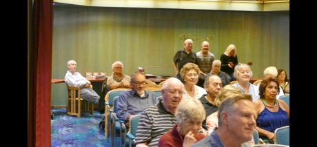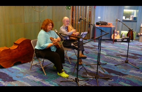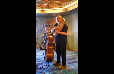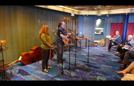 Gregg Avertt started off our fifth and last Open Mike session for the cruise. He claimed to have a poor voice due to cold but who could tell? Carolyn Lesh performed with Niels Jonker and Bill Eyler and showed that she can yodel with the best of them. Then Dave Baumann and Barbara Herber-Baumann hit us with your wonderful story lyrics and harmonies. Was that the ocean or Barbara making the ship sway to the beat? Sara Keller helped Kathie Ann Wieland with a song. Kathie can write songs and is a pretty good guitarist too. Margaret Crowl kept us straight with a gospel classic and also sang a French song learned in high school. Ask her about it sometime. Howard McGhee took his harmonica and autoharp to do justice to Danny Boy. Mary Larson and Edwina Goodhue live far apart but should get together to sing and play more often. Next up was “Big Bad” Jon Wolkomir. He’s a good guy and sang songs of his native Alaskan roots. Cindy Harris lit the room up with her smile and clever singing and playing. Betty Scott only came to play the autoharp but received a standing ovation. Bob Grappel played with Sara Keller as she taugh us a new song. This was a talented Open Mike session…they all were!