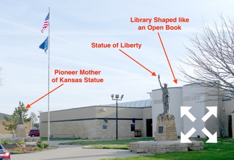 Not far from the Pancake Hall of Fame we found three things to place in one picture: A Library Shaped like an Open Book, the Pioneer Mother of Kansas Statue and a small replica of the Statue of Liberty. Nice!