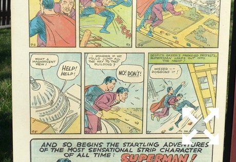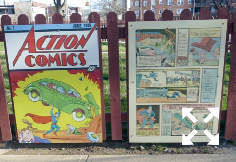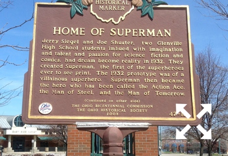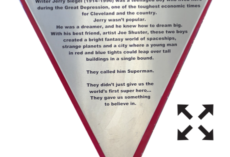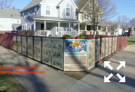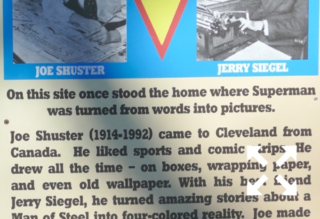 We drove through the busy streets of Cleveland OH to see the houses where Joe Shuster and Jerry Seigel lived. The first illustrated the Man of Steel and the second invented him. Posters of the first edition (April 1938) of Superman surround some of the front yard fence of Shuster’s house. The city also provided a nice plaque for being the birth place of Superman. What a kick!