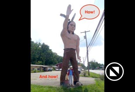 Later, in Parkersburg WV, Ellen and Tickle stood under a Giant Indian (muffler man) advertising for the Cherokee Village Title and License Center. Then we realized that the day was getting short and we had to head for the hotel…and what a room we received! We can definitely say that it was bigger than any of our three homes, with two full size walk-in closets, a glass dining room table and a full kitchen. Wow!