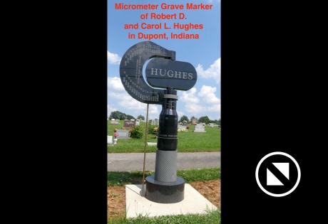 Just before driving through Dupont IN we took a picture of a large micrometer grave marker. Mr. Hughes, no doubt, used a much smaller instrument for his tool and die business. See the photo.