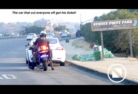 Zip! A small white car cut us off and did the same to others on the road. Before you could wink the long arm of the law had caught the offender. That’s quick justice. We cheered.