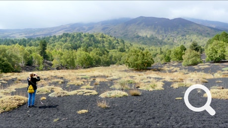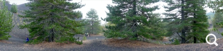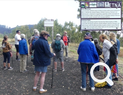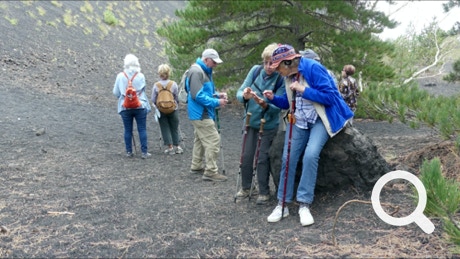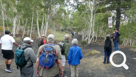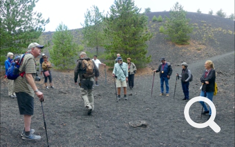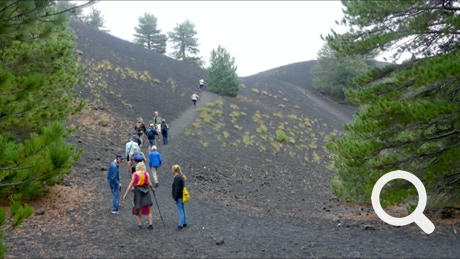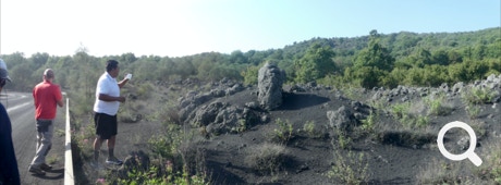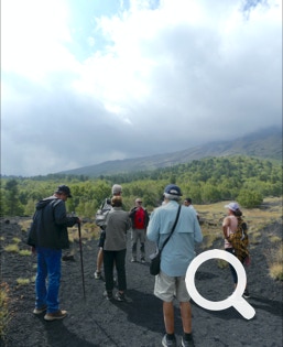We awoke to a beautiful sunrise as our ship, the Artemis, approached the harbor in Sicily right along side a beautiful sailing vessel, the Sea Cloud Spirit. As we left our ship and exited the marina we noticed a covering of black and gray dust over everything. Shop keepers and home owners were busy sweeping away the dust. Our local guide explained that it floated all the way to the harbor from the Mt. Etna Volcano. Today we headed up to Mt. Etna. The higher we got, the more black rocks appeared all around us…also from the volcano. We left the bus and hiked the countryside heading for a lower vent (cone) on the volcano. Jorge, Ellen and Anne decided not to take the steep hike to the rim and waited comfortably on tree stomps and rocks. We eavesdropped on other English-speaking tour guides as they gave information to their tours. Each guide had different things to emphasize.