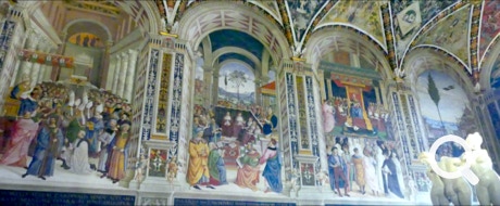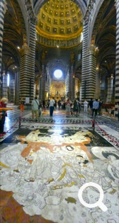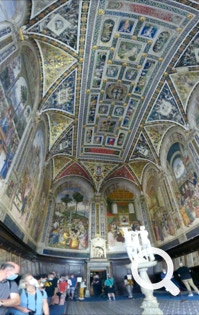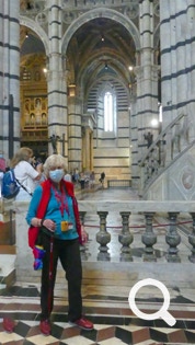 Although we usually do not enjoy ornate churches, we did like the lovely yet simple mosaic floors of the Duomo and its library. Later we went back to visit the recently dicovered crypt. Again we decided not to walk up the many stepped tower of the town hall. Ellen was braver today and had no trouble descending the hill/steps to the campo. That’s were paleo horse race takes place. We saw where the horses stay before the race. We had a pleasant lunch and gelato nearby.