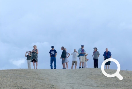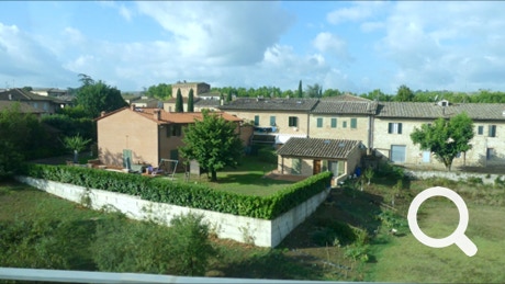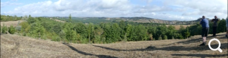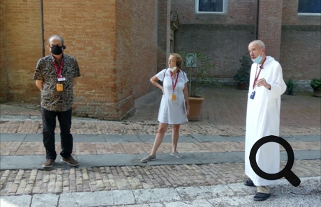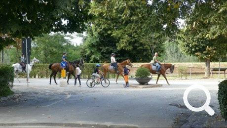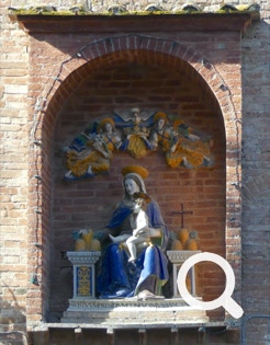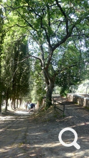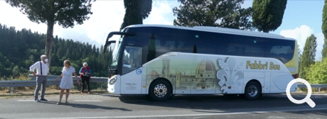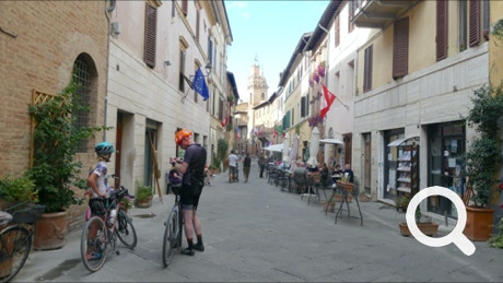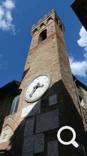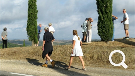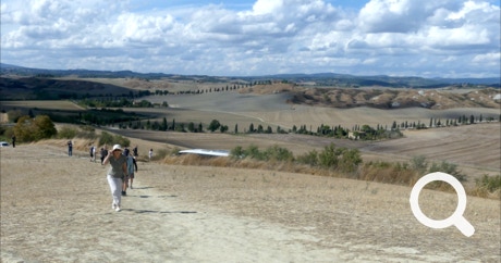 On the hill above the abbey we had lunch at a restaurant, very pleasant and relaxing. When we began our bus ride, the countryside had changed again. The cypress trees and lush gardens had been replaced by a much dryer and browner countryside. We stopped in the small village of Buonoconvento and Francine treated all of us to a special coffee with some whipped cream and chocolate. Outside the village there were some were large tents. Locals informed Francine that they were preparing for a big tournament for some card game. We walked around the the charming streets. Jorge and Ellen walked to the end of the town where we saw a group of horses and riders in English saddles.