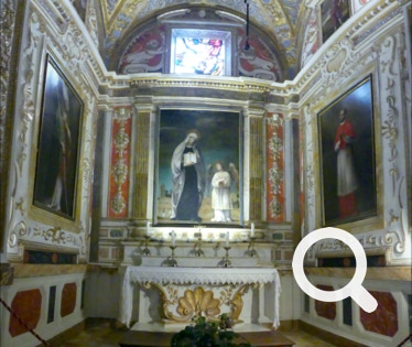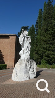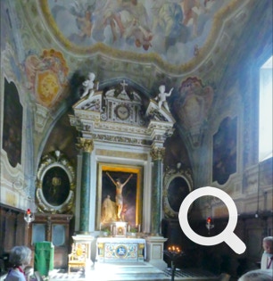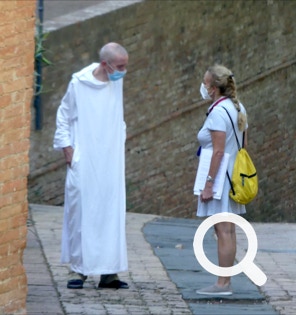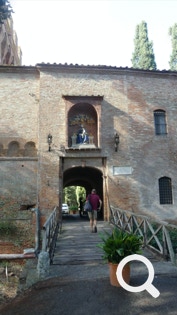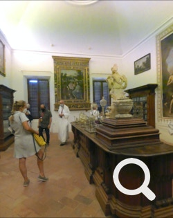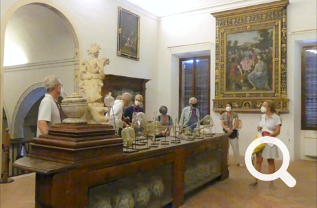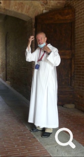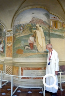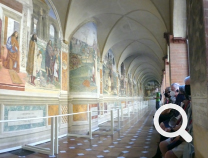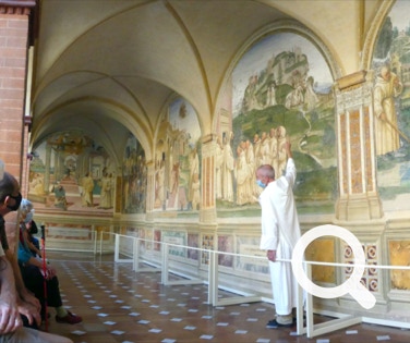 Then we walked along an outside cloister which has Frescoes covering three sides of a rectangular area. The majority of them were painted by Luca Signorelli, a relatively unknown artist at the time. Signorelli’s frescoes showed Benedict’s life within the context of the times. The artist definitely had a sense of humor and did not hesitate to include persons/items in his paintings showing he had been treated unfairly. For example, he painted those he didn’t like in unflattering ways. One got an arm painted significantly shorter than the other. The short arm was an expression used for those who had robbed, cheated others or were just plain cheap. Brother Joseph explained each fresco’s inconsistencies or ironic twists and we loved them.