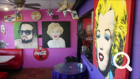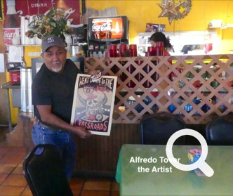 We met the owner of Pepe’s Cafe this morning. He said his name was Alfredo. He painted the artwork that hung on the walls. One was signed Tovar. So, that must be his last name. He said he liked Rock and Roll. The Mick Jagger painted of him working the puppet of Keith Richards shows a sense of humor. Jimmy Hendrix is usually pictured with a guitar but here he is in front of a mic. How subtle! Alfredo paints an unhappy Alice in Wonderland (referencing Jefferson Airplane’s ‘White Rabbit’). He knows his music. Stop by his cafe and look for him. You’ll enjoy the conversation! The food is excellent too!
