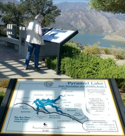 If you click on the little map above you’ll see that we chose to visit a couple museums today. The first one is a gem that hardly anyone knows about. Literally, thousands of drivers pass by it on Interstate 5 without ever noticing it. This jewel is called the Vista del Lago Visitor Center and is operated by the California Department of Water Resources. It has excellent restrooms and modern, interesting displays. It also has a great view of Pyramid Lake. It’s a must go to museum…and it is free!