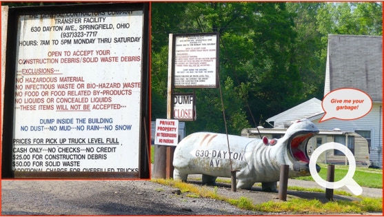 The Yawning Hippo stands in front of a garbage dump. Feed him your garbage!
