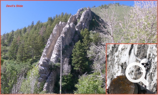 According to Wikipedia, “Devil's Slide is an unusual geological formation located near the border of Wyoming in northern Utah's Weber Canyon, near the community of Croydon in Morgan County, Utah, United States. The slide consists of two parallel limestone strata that have been tilted to lie vertical, protruding 40 feet out of the mountainside. Intervening layers have eroded more quickly, forming a channel some 25 feet wide running hundreds of feet down the mountain.” Somebody placed a human skull there and added a horn. Very funny!