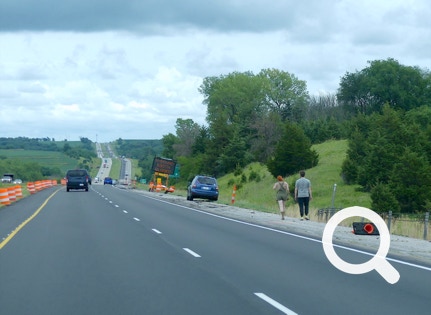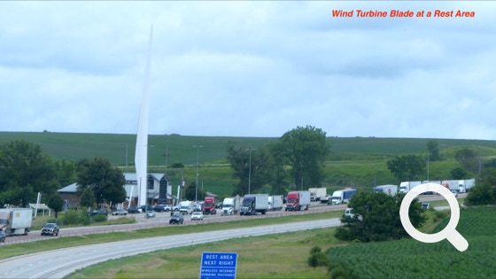 A wind turbine blade stands across Interstate-80 at a rest stop. That guy is big!