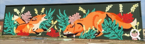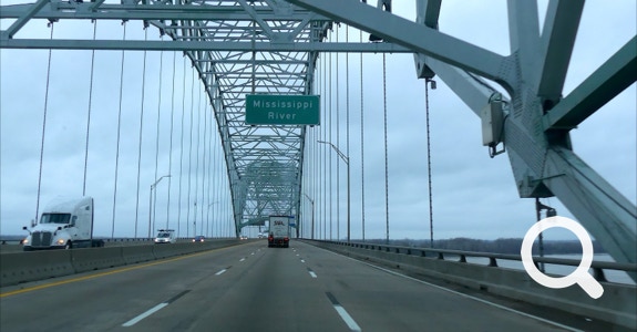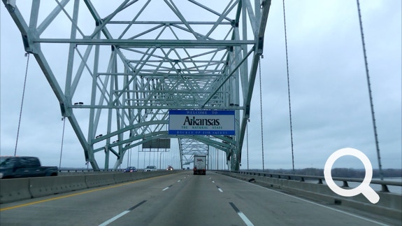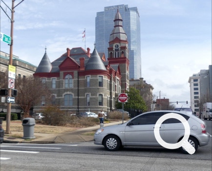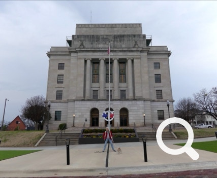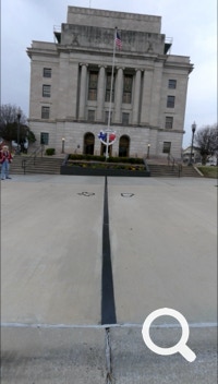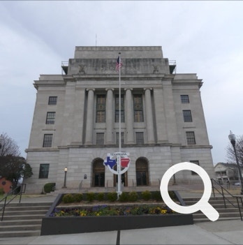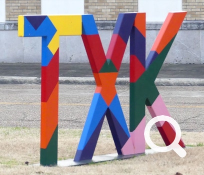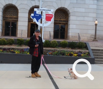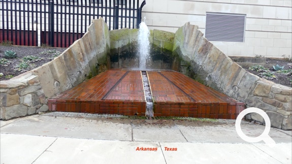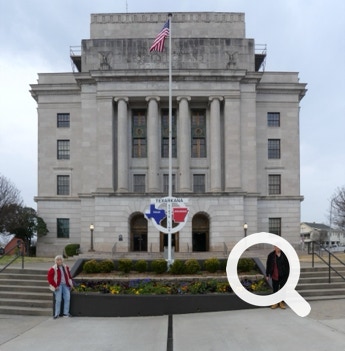 The Half-n-Half Post Office in Texarkana is built within a traffic circle. It is divided by the state line between Texas and Arkansas. On the north side is a waterfall with a line down its middle. On the other side of the building is a place to take photos. Tickle, Jorge and Ellen took advantage of this photo-opportunity.