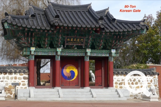 We drove ourselves to Little Rock AR to take a picture of an 80-ton Korean Gate. It was erected in honor of Taekwondo Grand Master Haeng Ung Lee who adopted Little Rock as his home town. At a cost of $1.4 million, the gate was carved from traditional Korean fir trees and took two months to reassemble. In addition the gate, there’s a statue of Grand Master Lee, plus statues representing two students, a fountain, and many ornamental plants.