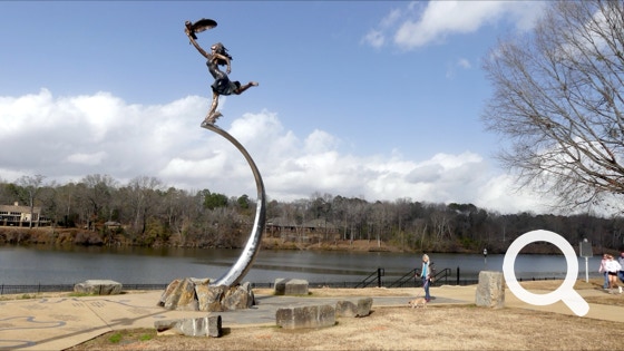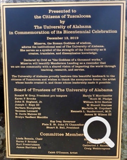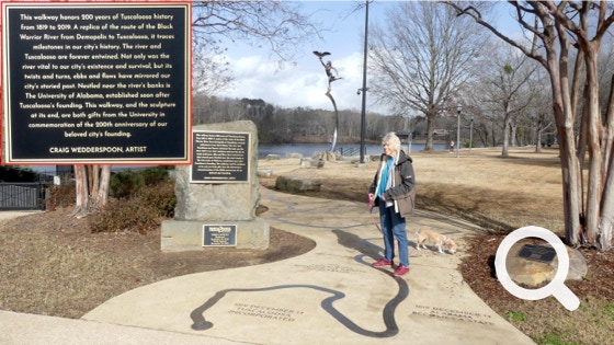 According to the park plaque: “This walkway honors 200 years of Tuscaloosa history from 1819 to 2019. A replica of the route of the Black Warrior River from Demopolis to Tuscaloosa, it traces milestones in our city's history. The river and Tuscaloosa are forever entwined. Not only was the river vital to our city's existence and survival, but its twists and turns, ebbs and flows have mirrored our city's storied past. Nestled near the river's banks is The University of Alabama, established soon after Tuscaloosa's founding. This walkway, and the sculpture at its end, are both gifts from the University in commemoration of the 200th anniversary of our beloved city's founding.”