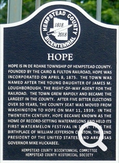 Mike Huckabee (Republican) and Bill Clinton (Democrat) were both born in Hope, AR. Mike was born in 1955 and Bill in 1946. Each served as governor of Arkansas. They also ran for President of the United States. Clinton became the 42nd President. Currently, Huckabee is the United States Ambassador to Israel. The town of Hope is proud of both of them!