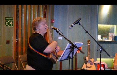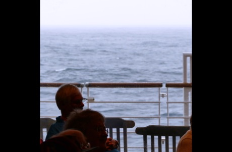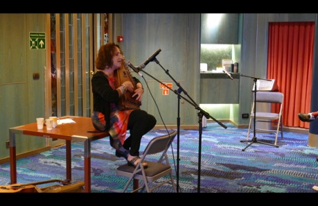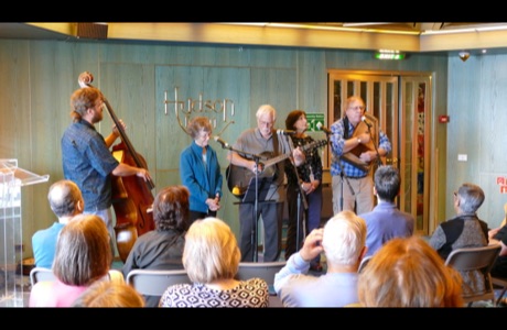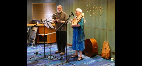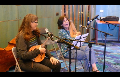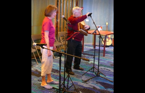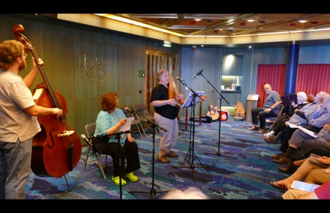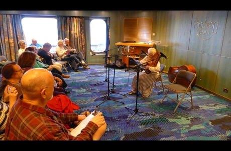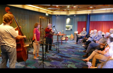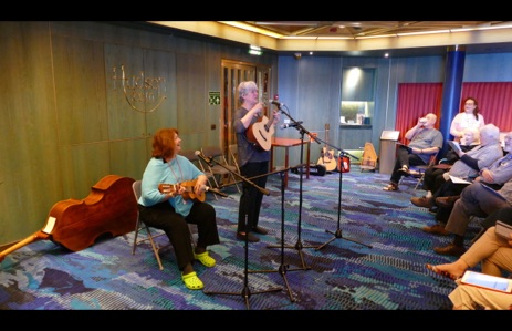 Gregg Avertt started off our fifth and last Open Mike session for the cruise. He claimed to have a poor voice due to cold but who could tell? Carolyn Lesh performed with Niels Jonker and Bill Eyler and showed that she can yodel with the best of them. Then Dave Baumann and Barbara Herber-Baumann hit us with your wonderful story lyrics and harmonies. Was that the ocean or Barbara making the ship sway to the beat? Sara Keller helped Kathie Ann Wieland with a song. Kathie can write songs and is a pretty good guitarist too. Margaret Crowl kept us straight with a gospel classic and also sang a French song learned in high school. Ask her about it sometime. Howard McGhee took his harmonica and autoharp to do justice to Danny Boy. Mary Larson and Edwina Goodhue live far apart but should get together to sing and play more often. Next up was “Big Bad” Jon Wolkomir. He’s a good guy and sang songs of his native Alaskan roots. Cindy Harris lit the room up with her smile and clever singing and playing. Betty Scott only came to play the autoharp but received a standing ovation. Bob Grappel played with Sara Keller as she taugh us a new song. This was a talented Open Mike session…they all were!