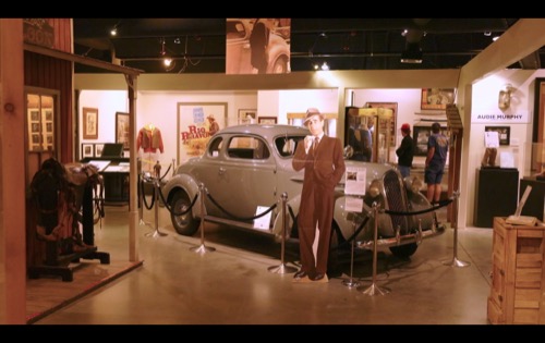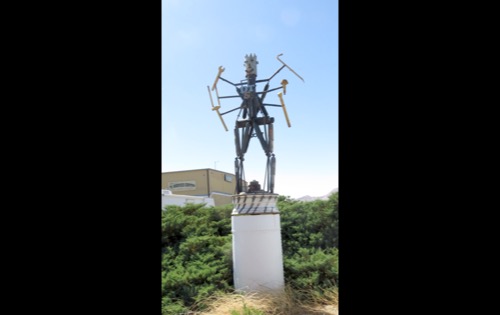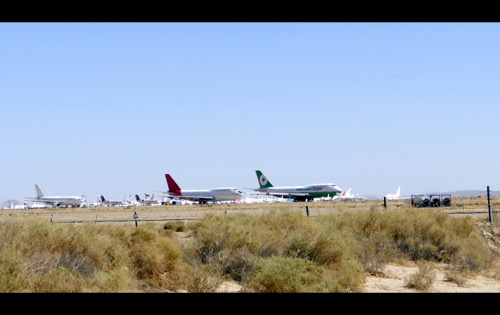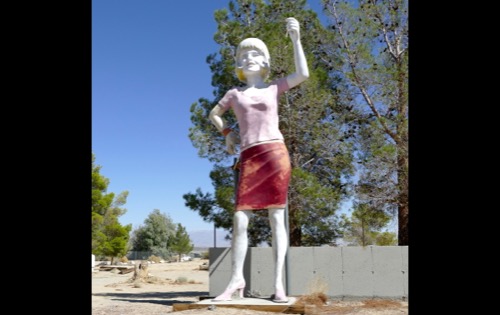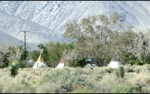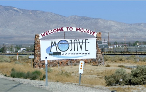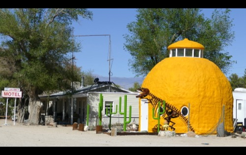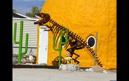 We dined in Mojave where we caught a re-bar man (ready for any job) representing the Desert Truck Service Company. Nearby we located the Rotary Rocket Raton and Space Ship One Replica in Legacy Park. The park is still under construction and we promise to visit again. Jorge caught some distant pictures of an airplane graveyard. Access is prohibited but we still have eyes. Small planes were landing at the local air field. Then we headed for “dem thar hills” to find and orange house, a motorcycle on a pole, and the Lone Pine Film History Museum.
