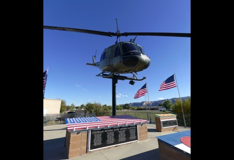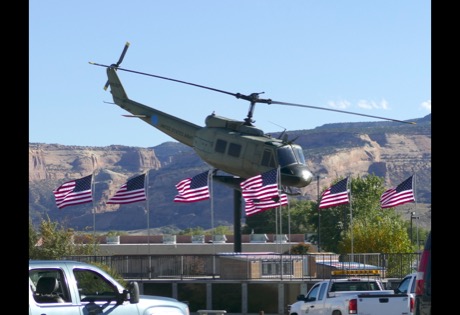 Cisco Ut is another ghost town. Yes, another ghost town! It was a railroad town and with its decline the town went bust. That Interstate 70 bypassed it was the last straw to break its back. There are signs that someone is living there but who? Check out that girl on the four wheels below. What is that thing she is riding? A Huey helicopter is placed on a pole at a Vietnam Memorial in Fruita CO. So many have died for us.